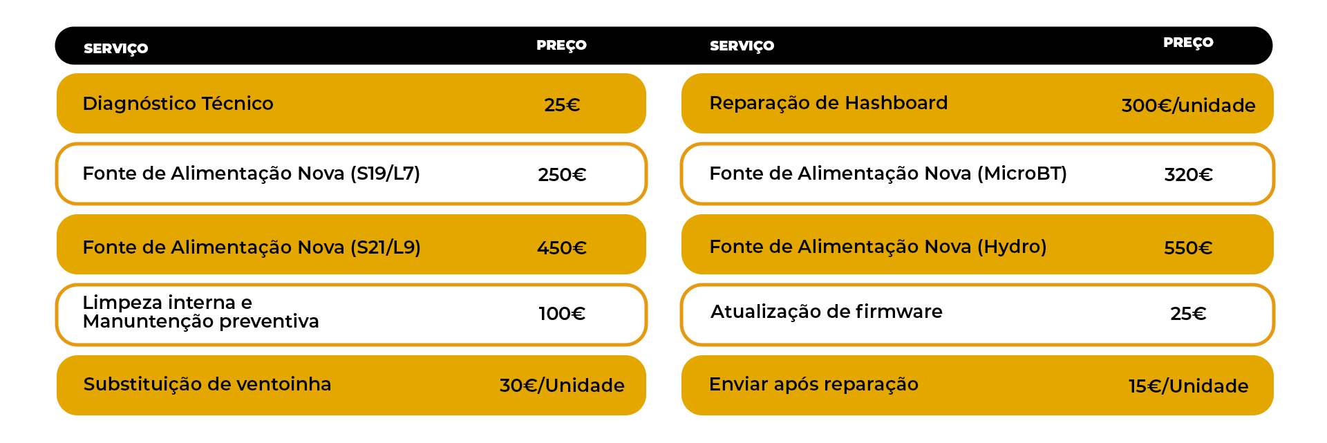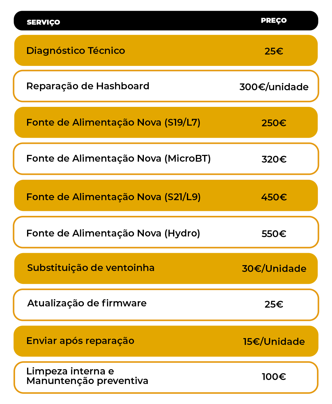 O diagnóstico é gratuito caso o orçamento seja aceite. Nas reparações de hashboards está incluída a substituição da pasta térmica. Se a reparação da fonte de alimentação não for possível, podemos fornecer uma fonte nova mediante custo adicional.